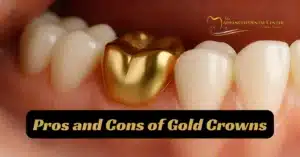 Close-up of teeth with a gold dental crown, overlaid with the text "Pros and Cons of Gold Crowns," highlighting the key pros and cons of gold crowns, with a dental center logo in the background.