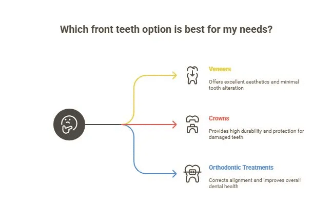 For front teeth, veneers are often preferred if your teeth are healthy and you only want to improve color or shape. Crowns may be chosen if your tooth is fractured or heavily filled.