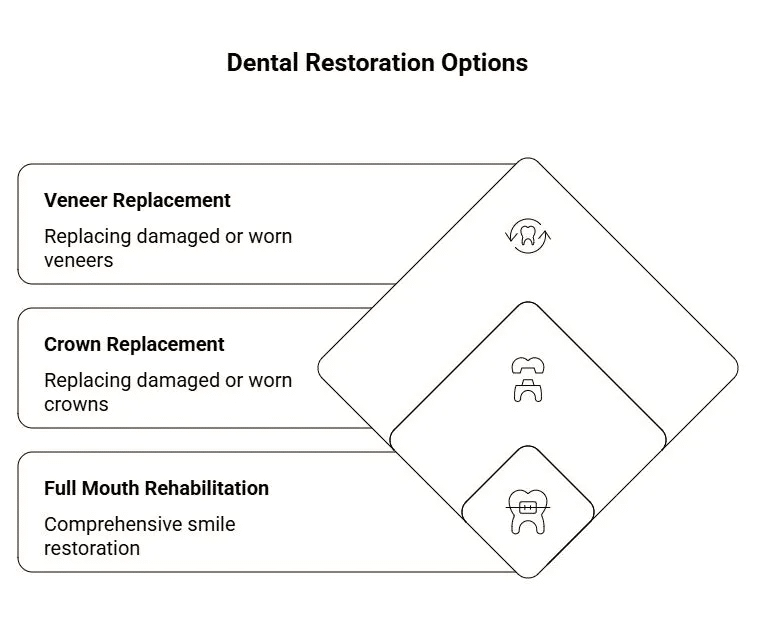 Yes. Crowns and veneers can be replaced if they loosen, chip, or if gums recede. Replacement is usually straightforward. For full smile restoration, explore full mouth rehabilitation.