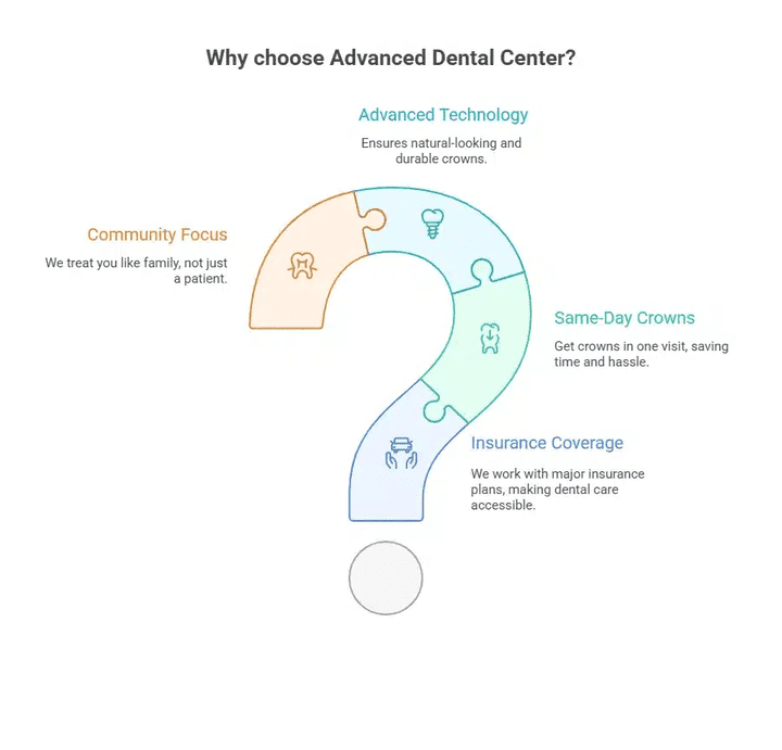 At Advanced Dental Center, our staff helps patients maximize their insurance benefits and explains out-of-pocket costs clearly. For example, if your crown costs $1,500 and your plan covers 50%, you’ll pay about $750 (if you haven’t reached your annual maximum). We also offer flexible payment plans for those without coverage.